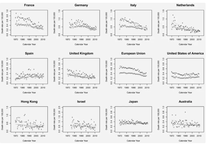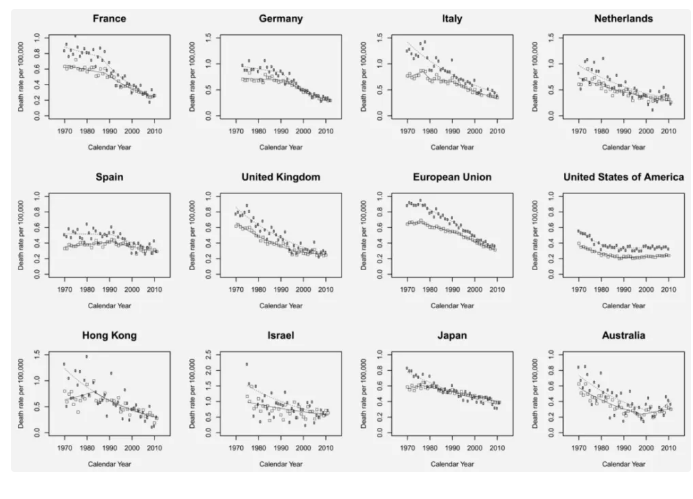 1970 年至 2012 年,在不同國家和地區(qū),女性甲狀腺癌死亡率穩(wěn)定下降,圖片來源:參考文獻[4]