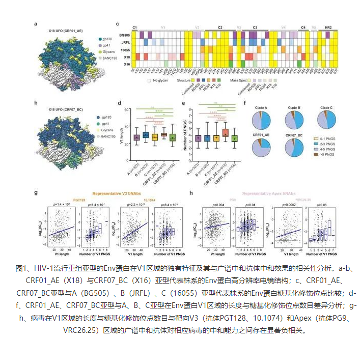 研究團隊首先利用單分子冷凍電鏡技術(shù)與生物大分子質(zhì)譜全面揭示了CRF01_AE和CRF07_BC代表型株系的Env蛋白結(jié)構(gòu)與糖基化修飾(圖1a-c)。隨后從上述研究中獲得的線索出發(fā),對當前數(shù)據(jù)庫中六千余條不同亞型的Env蛋白的V1區(qū)域進行了跨亞型對比和分析。結(jié)果顯示,相比于其他亞型,CRF01_AE亞型的V1區(qū)域長度顯著增長(圖1d),且糖基化修飾位點數(shù)目顯著增多(圖1e-f)。進一步對中和實驗數(shù)據(jù)和V1區(qū)域特征的關(guān)聯(lián)分析則顯示CRF01_AE亞型在V1區(qū)域的上述特征會明顯削弱兩類廣譜中和抗體(分別靶向Env蛋白的apex與V3區(qū)域)對CRF01_AE亞型的中和效果(圖1g-h)。上述研究結(jié)果提示,應(yīng)盡量避免在CRF01_AE亞型的流行區(qū)域開展靶向Apex或V3區(qū)域的免疫聚焦型疫苗或廣譜中和抗體的臨床試驗。